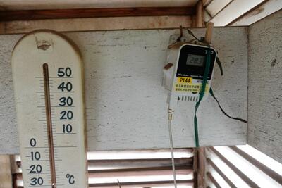 本校の百葉箱には、温暖化対策調査のため、埼玉県の環境センターの温度計が設置されています。